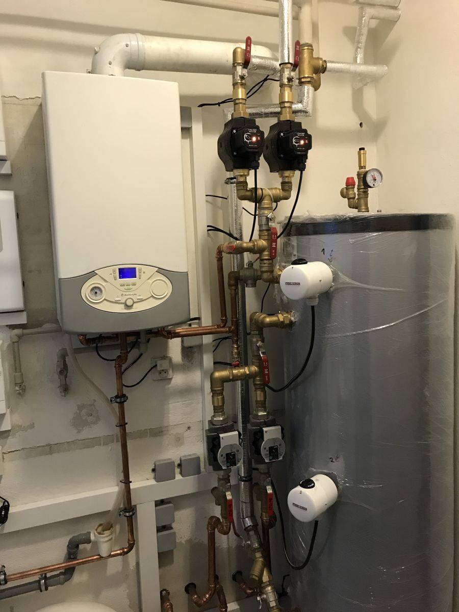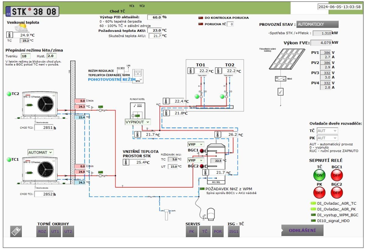 Tepelné čerpadlo vzduch-voda 2ks HPA-O 13 PREMIUM STIEBEL ELTRON, akumulační zásobník 400L bez ohřevu teplé vody. Napojeno na stávající rozvody UT, TUV. Bivalentní dotop, záložní zdroj - plynový kotel ARISTON 25kW.