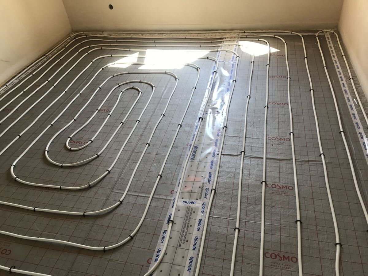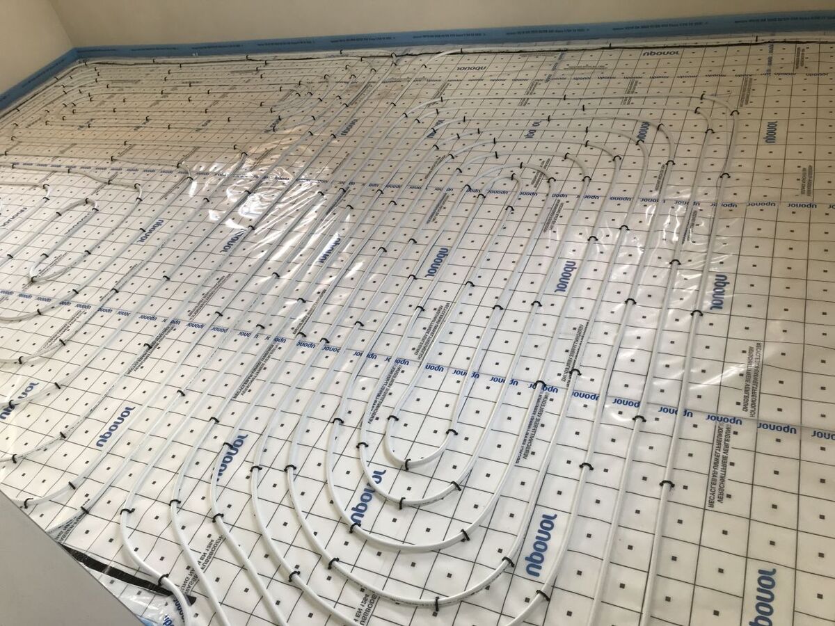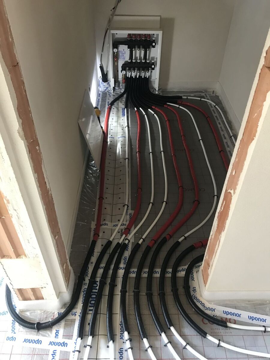Podlahové topení UPONOR, napojeno na nové rozvody UT, rozdělovač UPONOR.