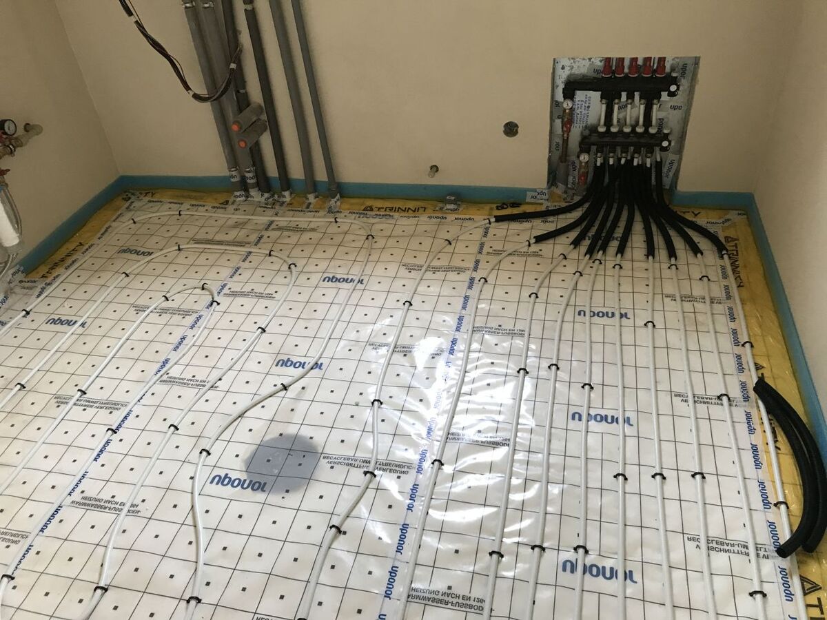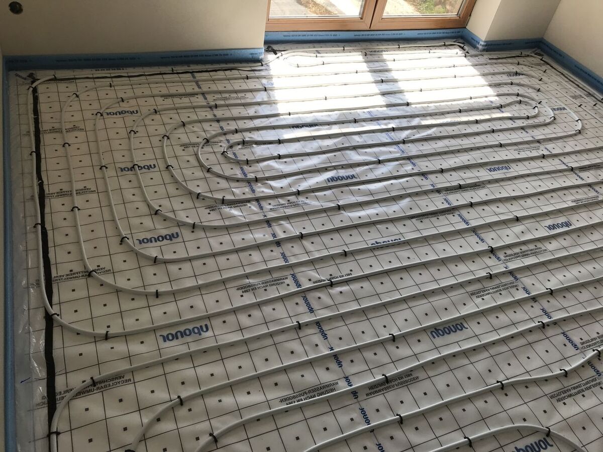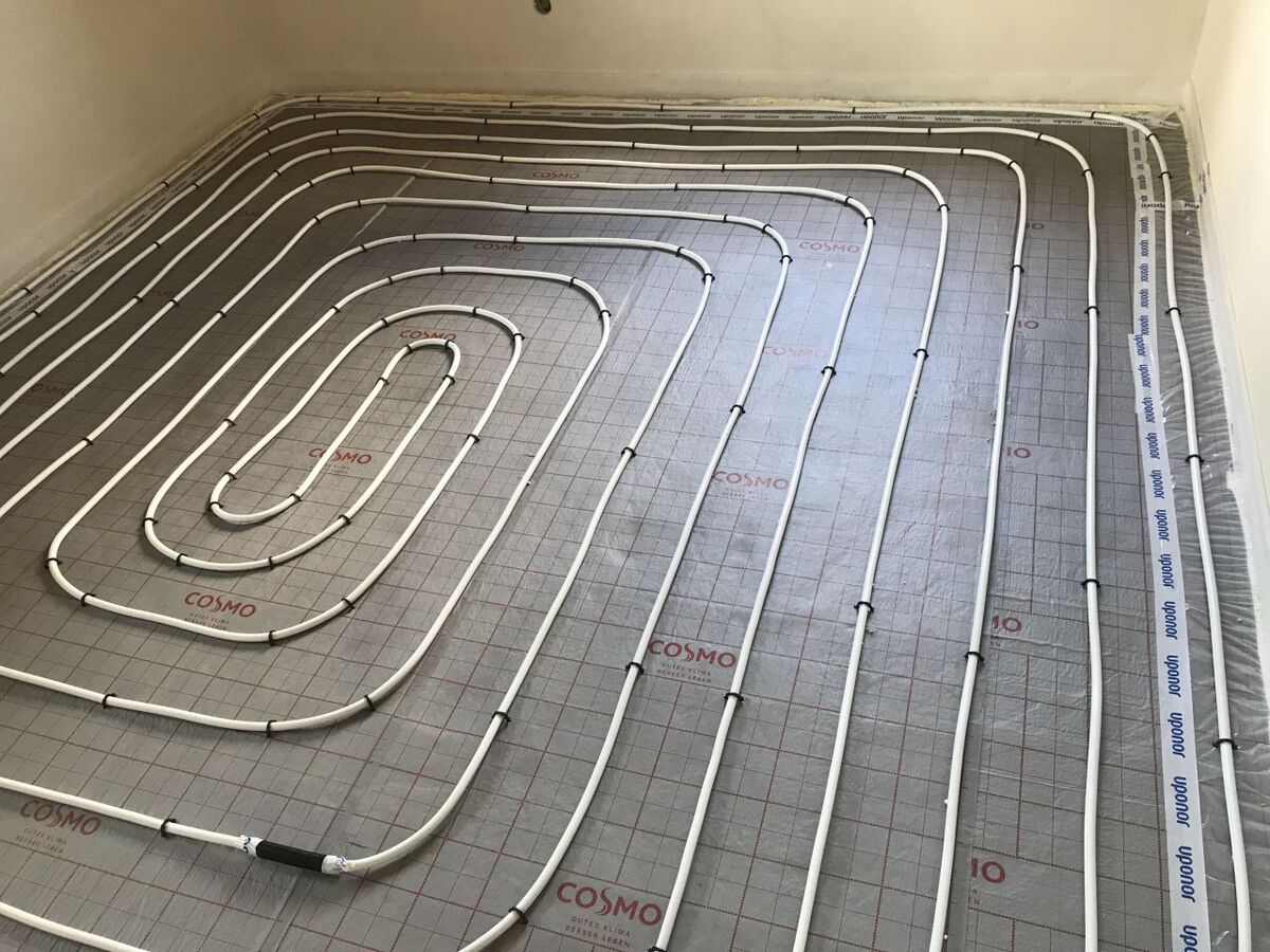 Podlahové topení UPONOR, napojeno na nové rozvody UT, rozdělovač UPONOR.