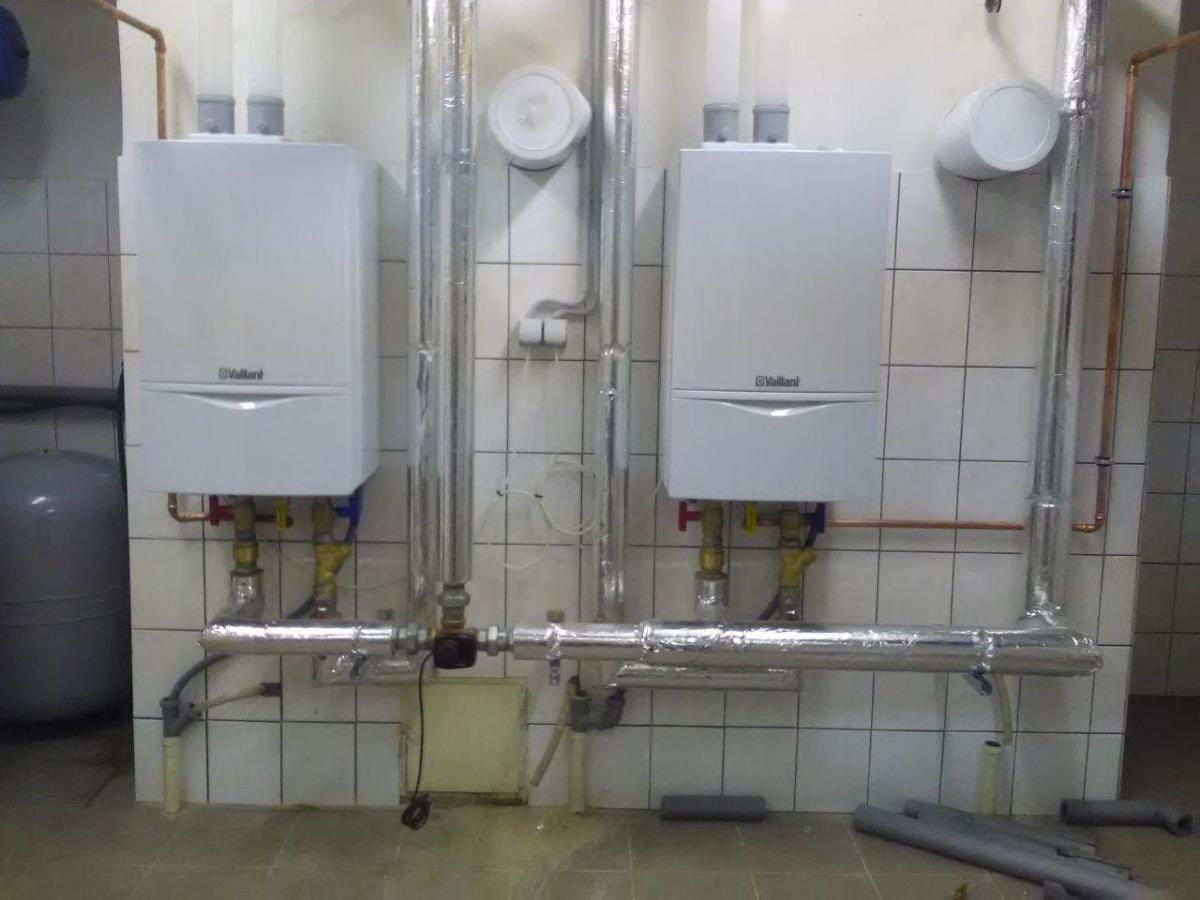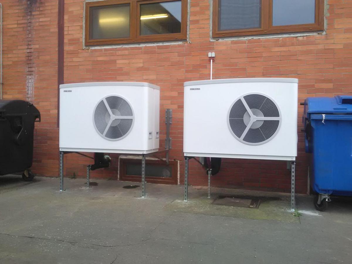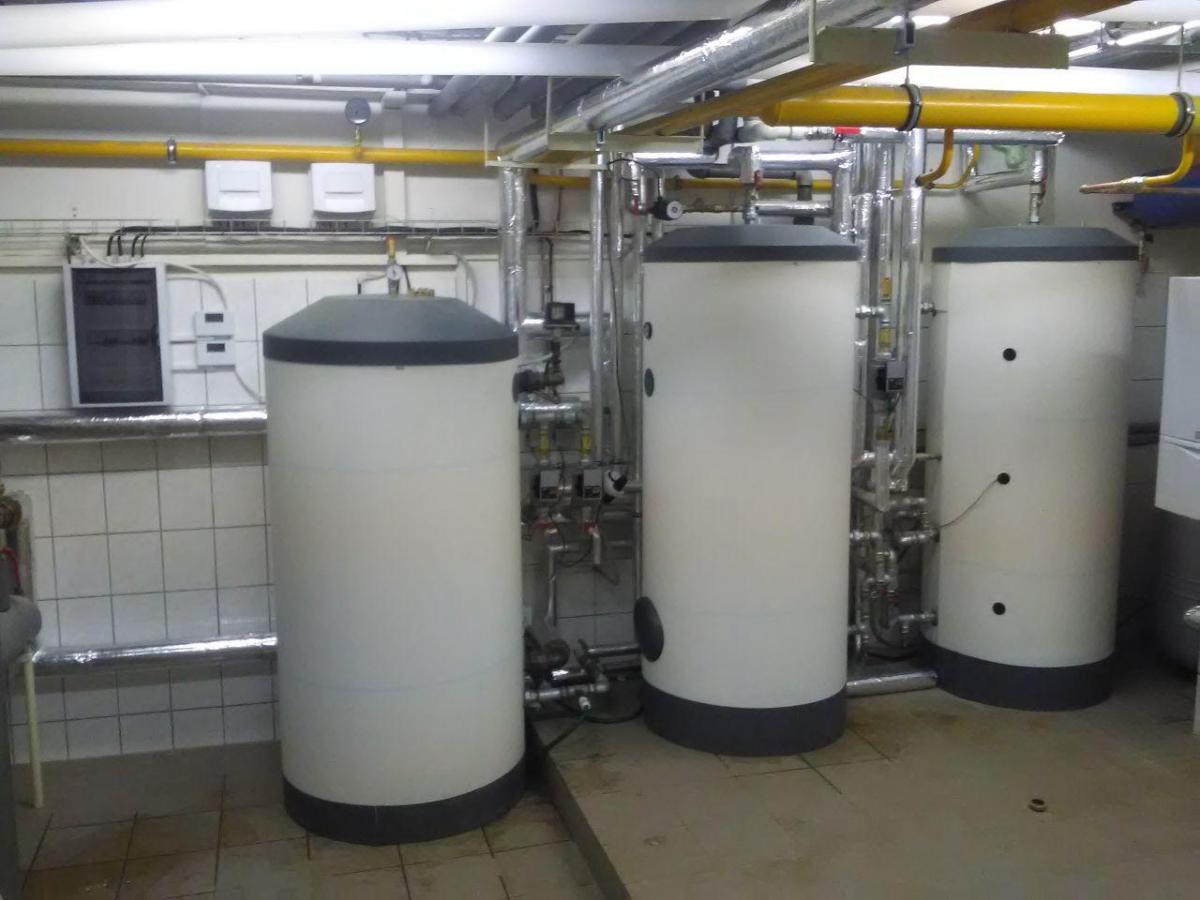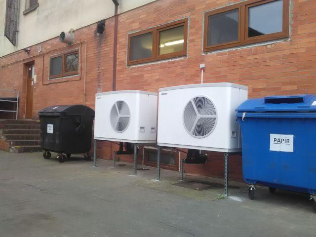 Tepelné čerpadlo vzduch-voda 2ks WPL 25AC STIEBEL ELTRON, akumulační zásobník 700L SBP700, 2ks zásobníků 500litrů SBB501WP pro ohřev teplé vody. Napojeno na stávající rozvody UT, TUV. Bivalentní dotop, záložní zdroj - 2x plynový kotel VAILLANT 48kW.